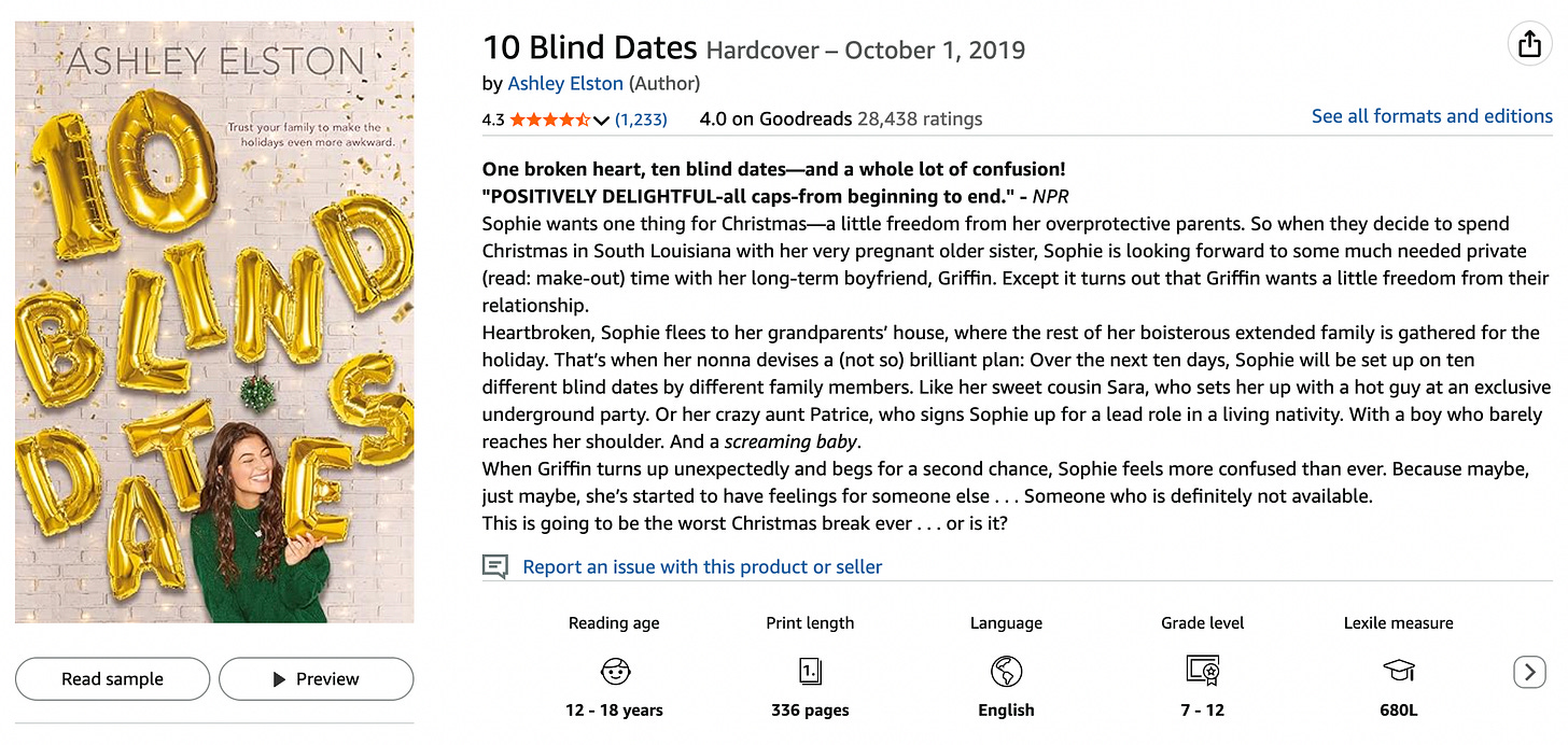 When you look up young adult titles, you’ll see that some are rated 12+ while others are 14+ or even 16+. You can check these details on the publisher’s website, but Amazon can be helpful, too (although it often aggregates based on customer feedback, not the publisher’s ratings, which can be iffy and highly subjective).